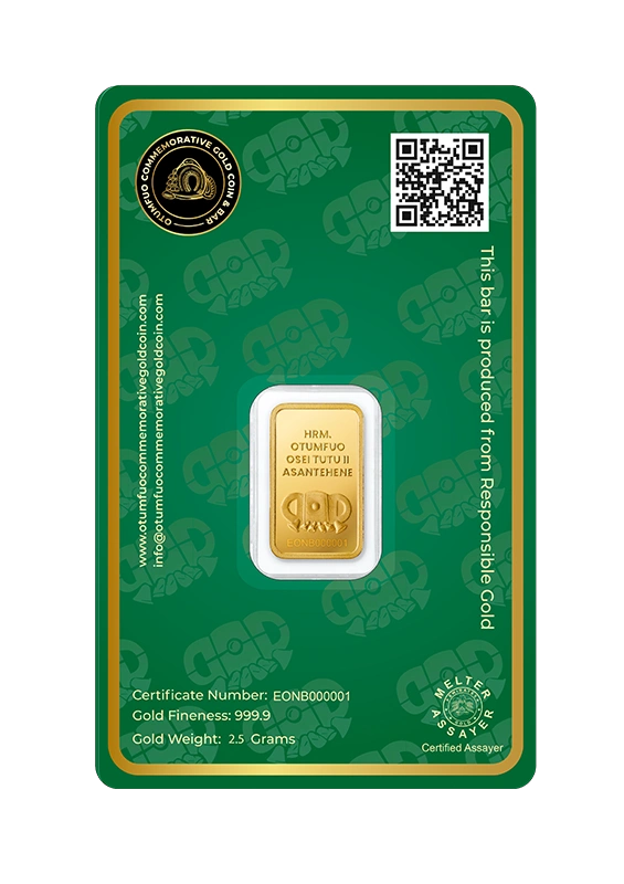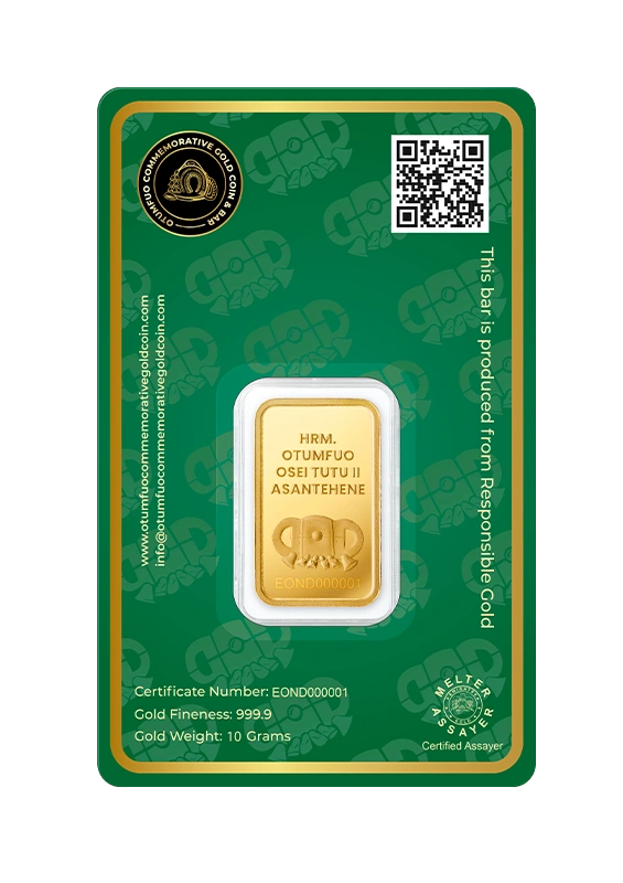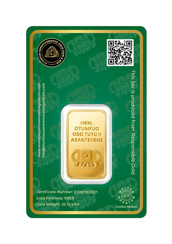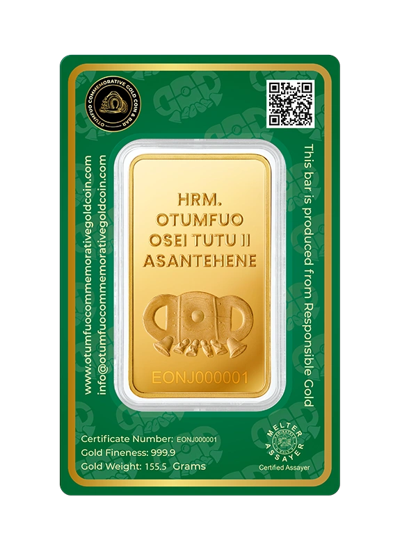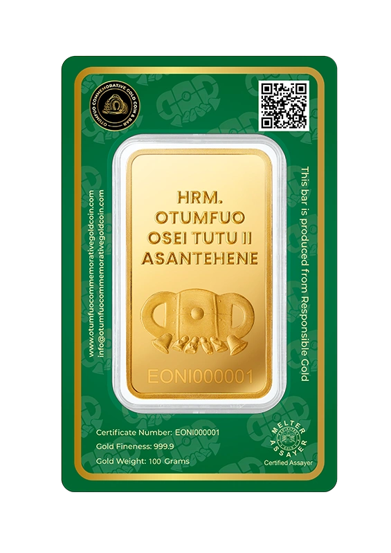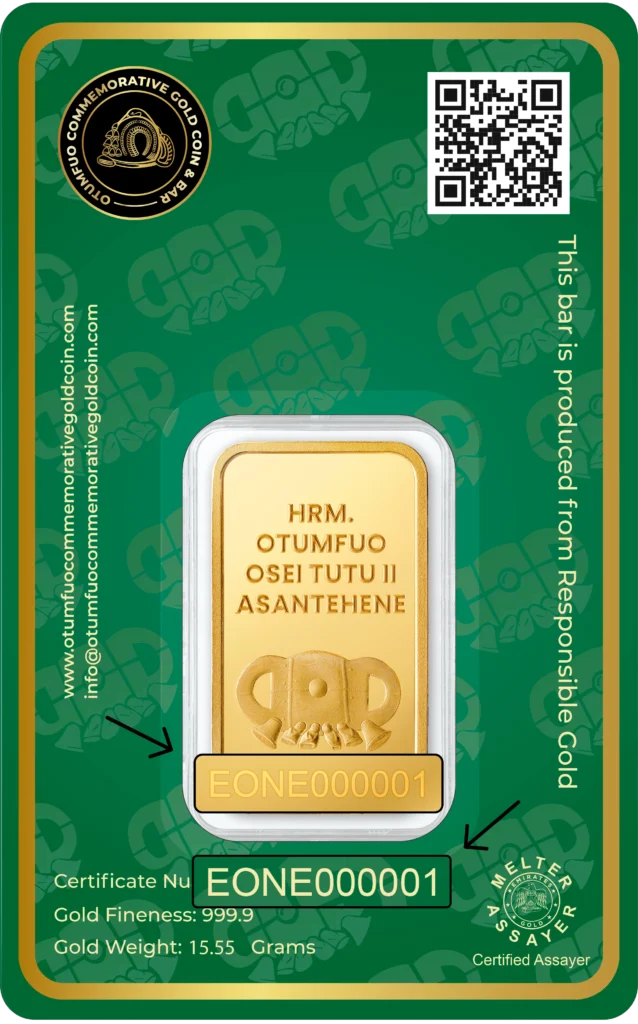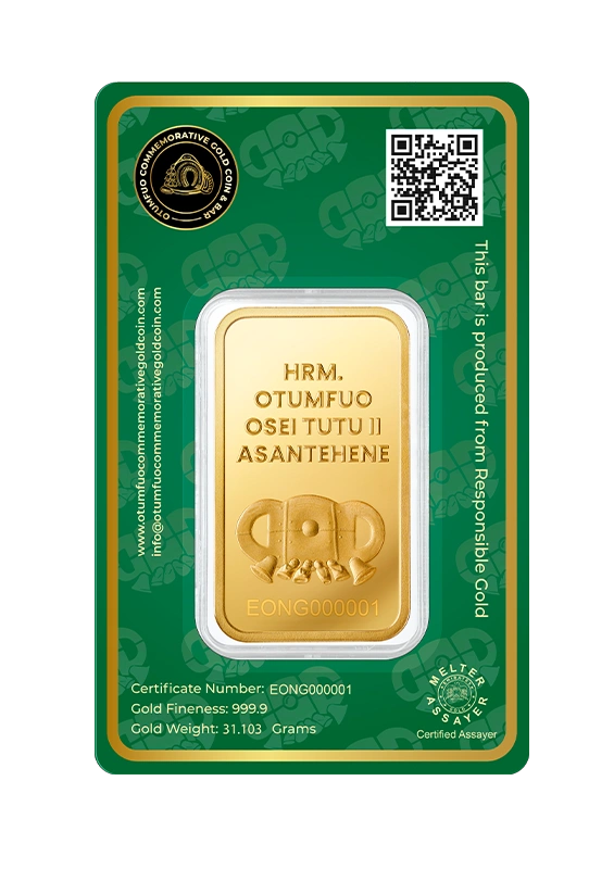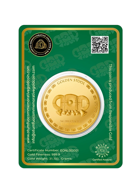 Each piece in the Gold Coin Project is made from 999.9 pure, ethically sourced green gold, paying homage to His Majesty Otumfuo Osei Tutu II’s reign and vision. Peace, tradition, and the artistry of fine minting are all reflected in each coin and bar.