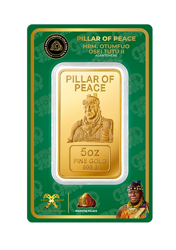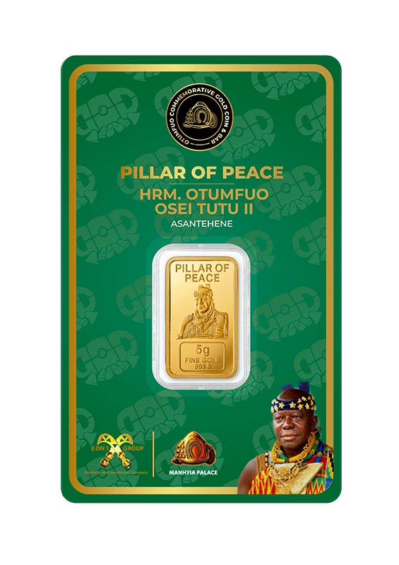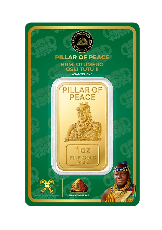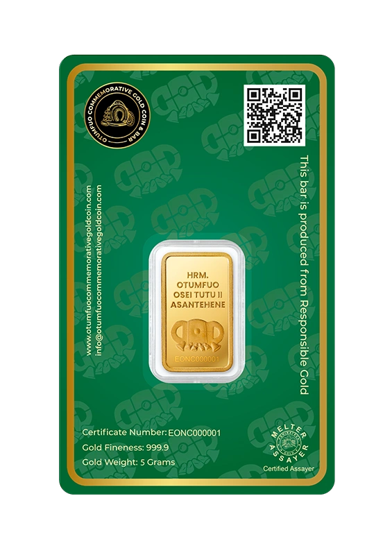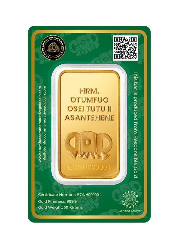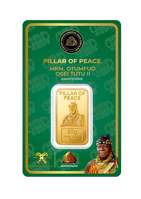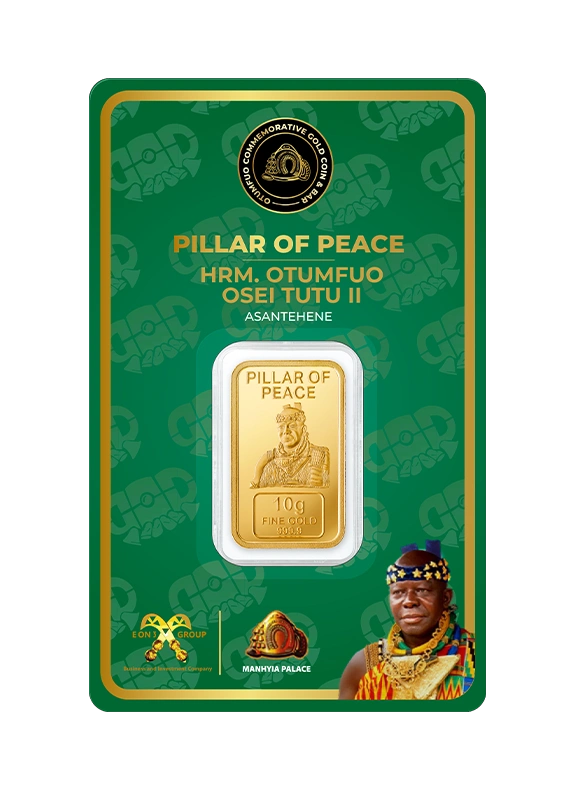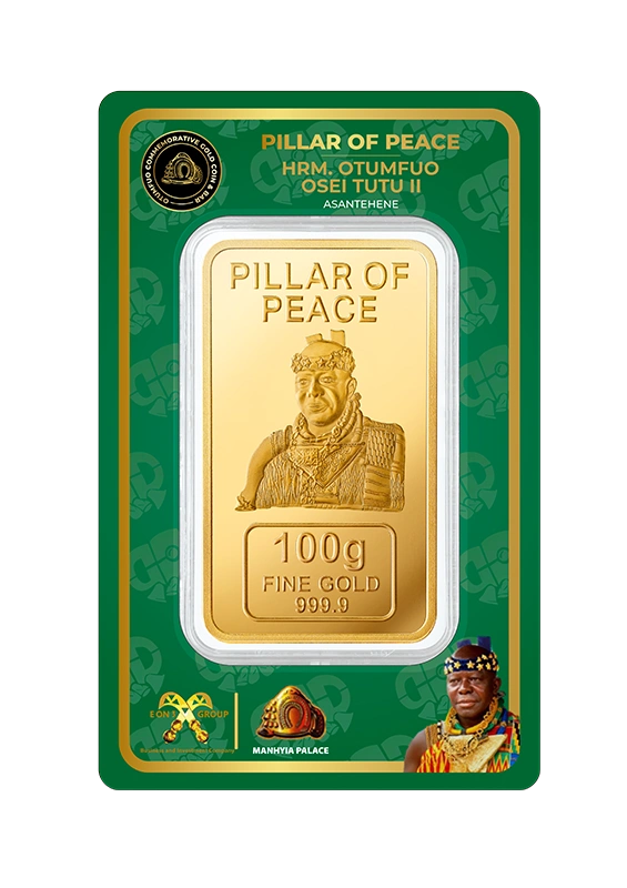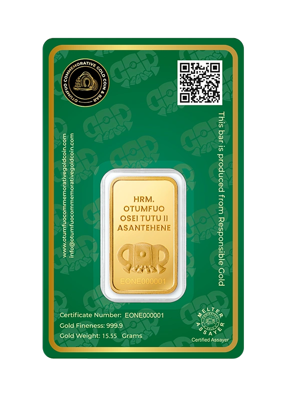 Each piece in the Gold Coin Project is made from 999.9 pure, ethically sourced green gold, paying homage to His Majesty Otumfuo Osei Tutu II’s reign and vision. Peace, tradition, and the artistry of fine minting are all reflected in each coin and bar.