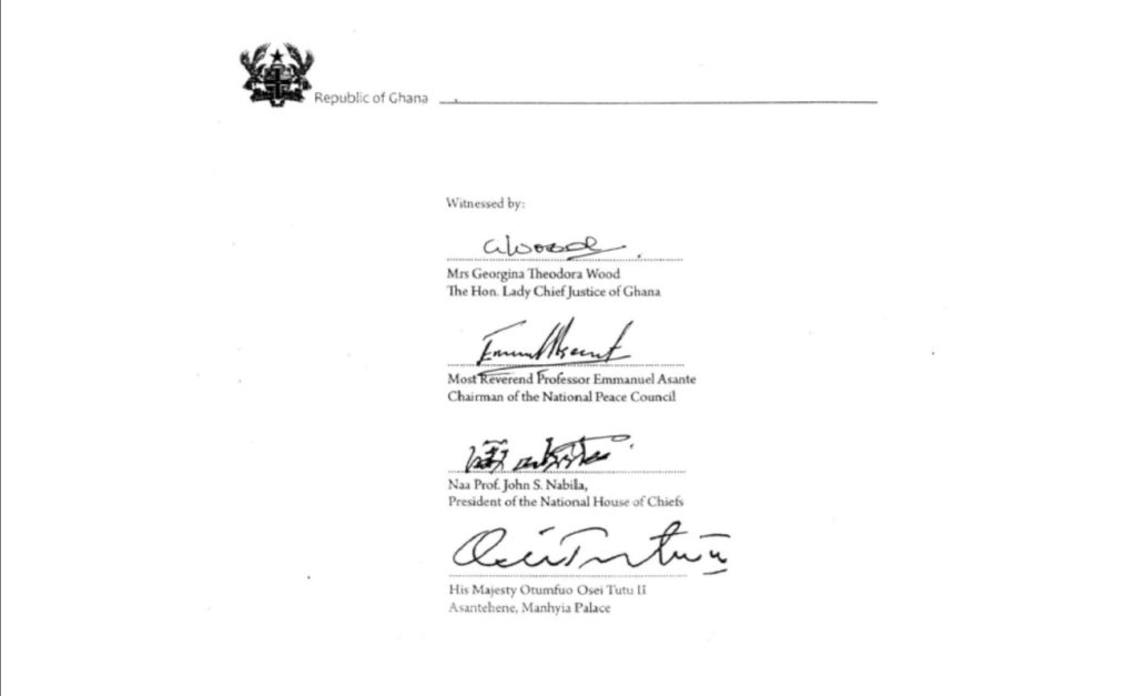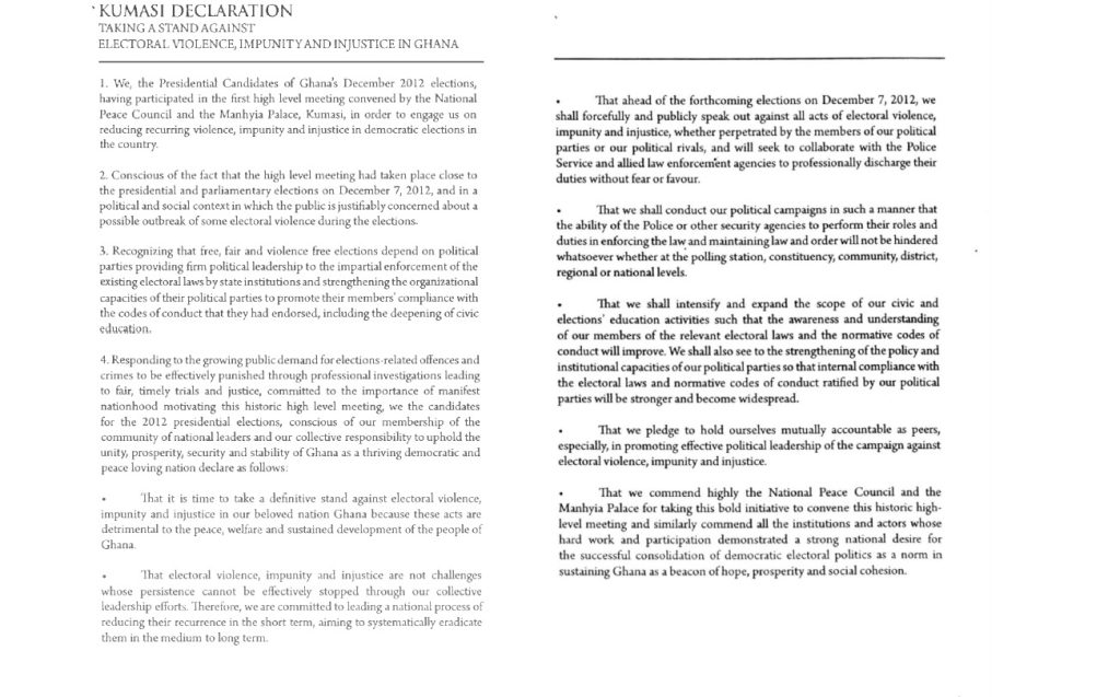 Otumfuo Osei Tutu II, the convener, was one of the four personalities who witnessed the Kumasi Declaration. The ensuing elections came off without the widely feared partisan disruption or violence.