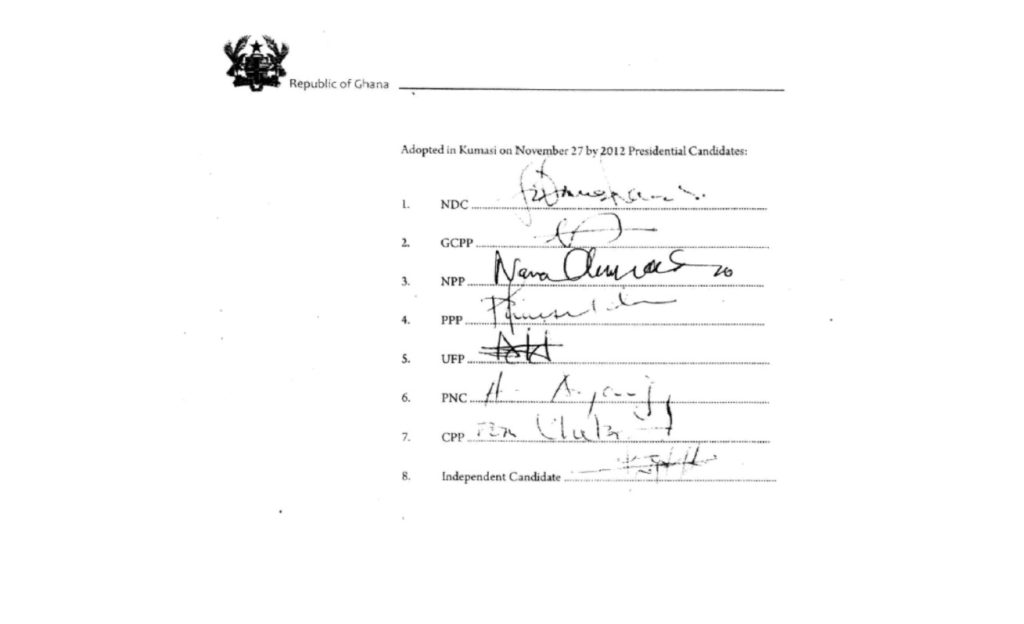 At the conclusion of the meeting, which took place just ten days to the general elections, all eight Presidential Candidates committed themselves to peaceful elections and signed onto a document, dubbed “The Kumasi Declaration: Taking a Stand Against Electoral Violence, Impunity and Injustice in Ghana”.